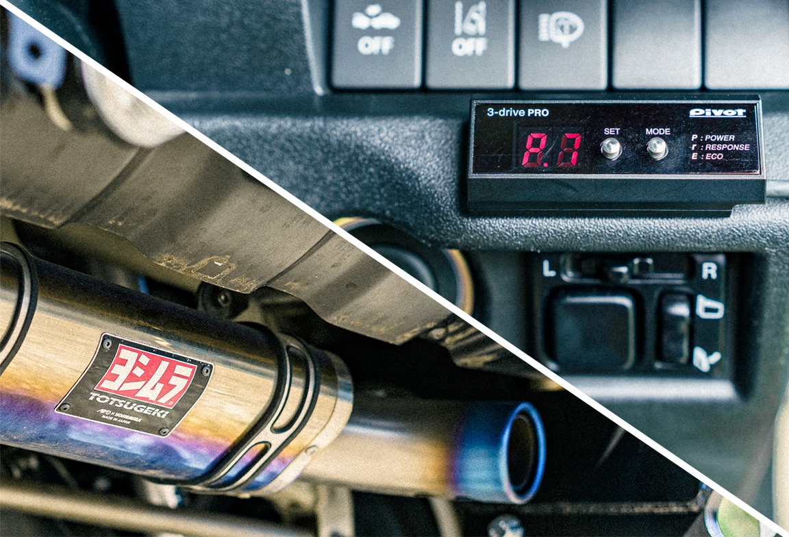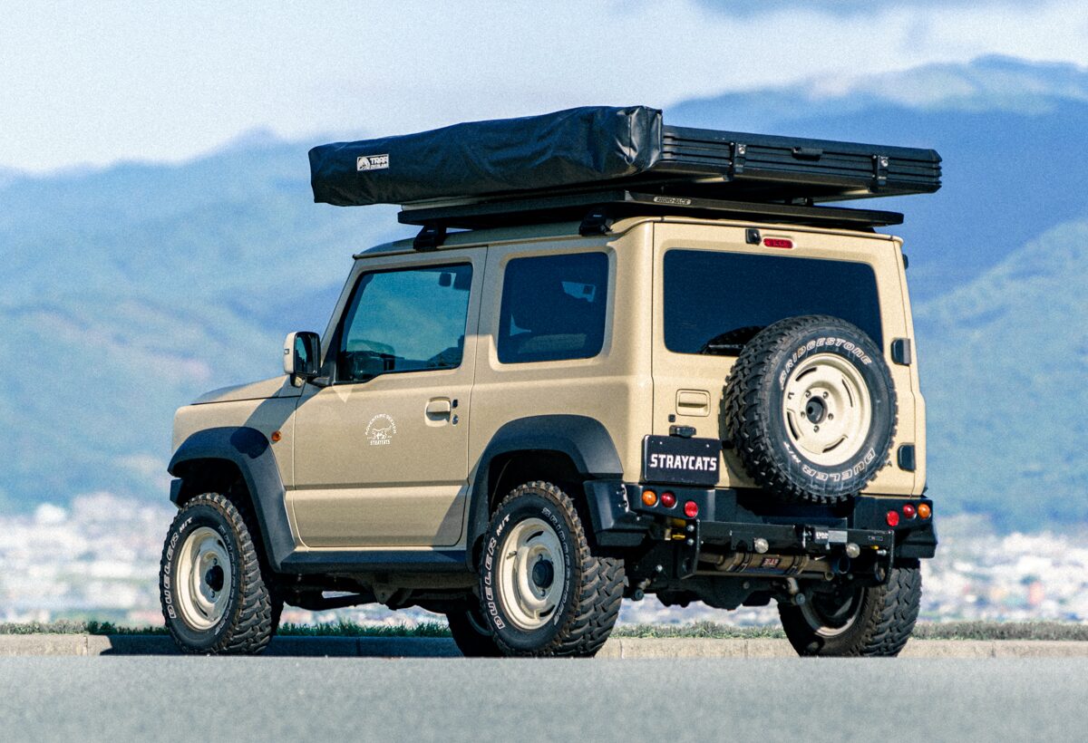 リフトアップ、ラテラルロッド、鉄チン風軽量アルミホイール、BRIDGESTONEのDUELER M/T、スロットルコントローラー、ヨシムラのチタンマフラー等本格オフローダー仕様。ルーフテントが搭載されてるとは思えない安定した走りが特徴です。