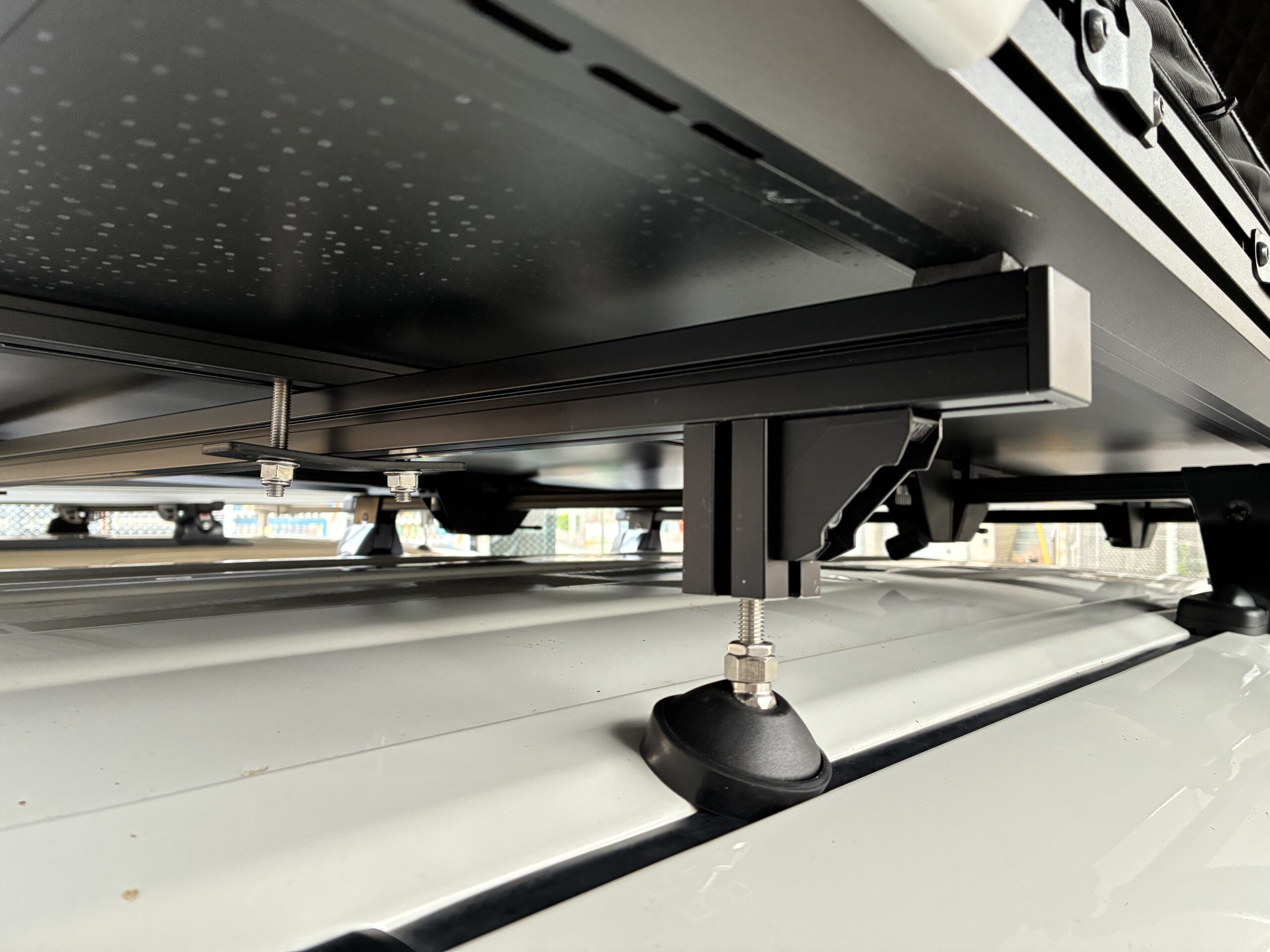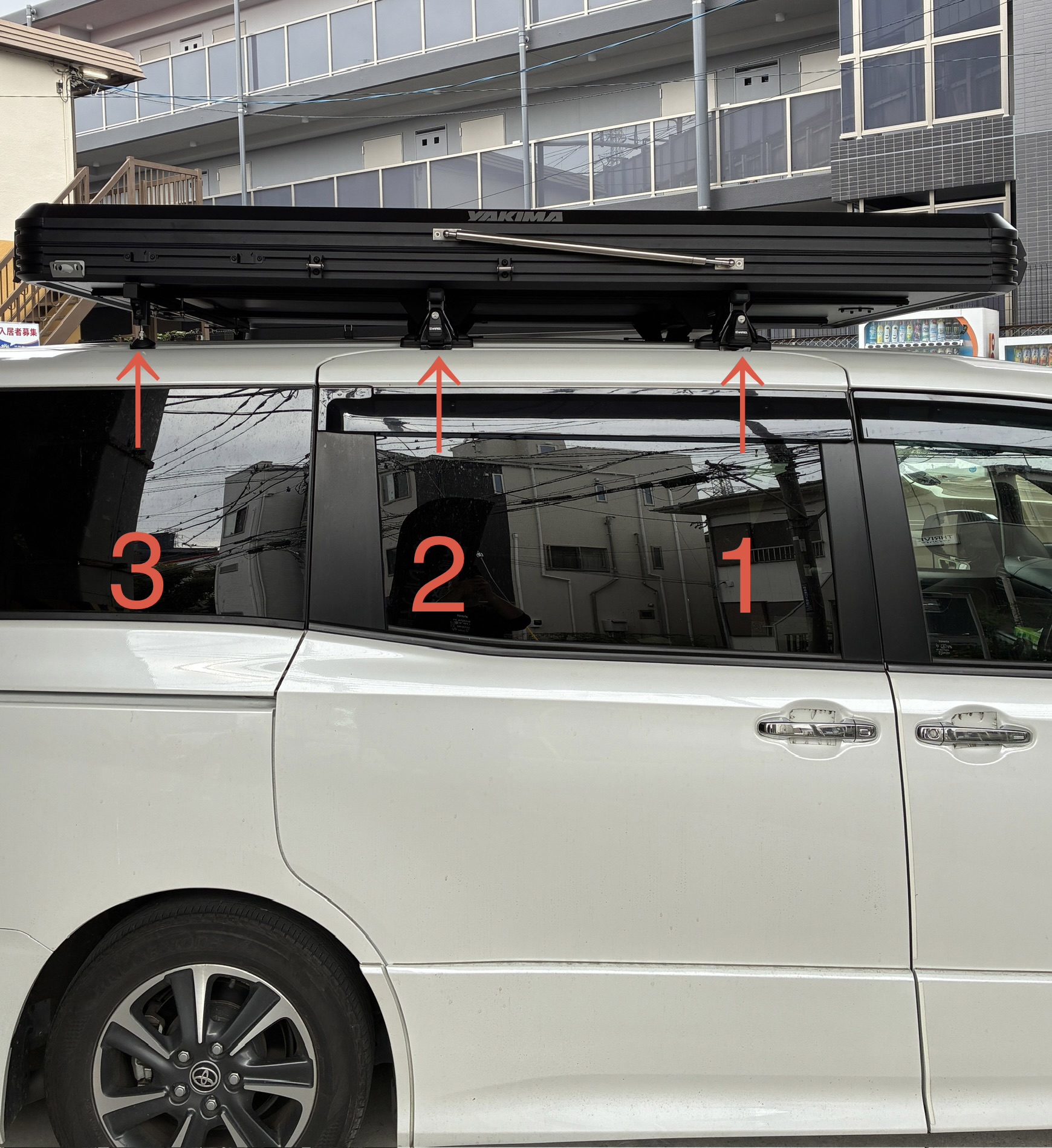 ミニバンにルーフトップテントを取り付ける場合に起こる問題点は、ベースキャリアの固定場所がスライドドアの開口部分にある点です。その為バーとバーの間隔が狭くルーフトップテントを固定する際に安定して支えることが出来ません。